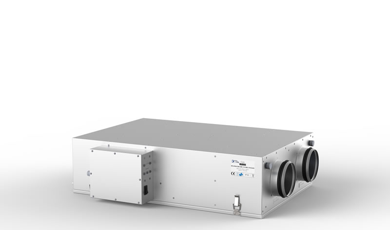 Galvaniz sac malzemeden üretilmiş, tavana monte edilebilen kanal tipi hava işleme cihazı, hava yenileme ve tahliye havasından ısı geri kazanımı sağlayarak maksimum enerji verimliliği sunar. Hava yenileme debisi 110 m³/h, ters akışlı eşanjör verimliliği %90’ın üzerinde, UNI EN ISO 3746:1997’ye göre ses gücü seviyesi 52 dB(A). Cihazda, ErP 2018’e uygun olarak otomatik free-cooling ve filtre tıkanıklığı uyarısı bulunmaktadır.