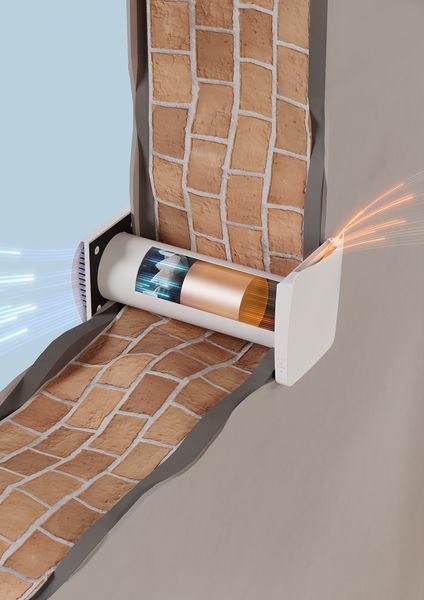 KERS+ ısı geri kazanım ünitesinin montajı için dış hava ile temas eden bir duvara, şekilde belirtilen çapta bir delik açılması gerekmektedir. Teleskopik kanal sayesinde Kers, duvar kalınlığına aletsiz olarak uyum sağlar. 230 V normal elektrik beslemesi gereklidir ve ayarlamalar, cihaz üzerindeki gömülü düğmeler veya pakete dahil olan uzaktan kumanda ile yapılabilir.