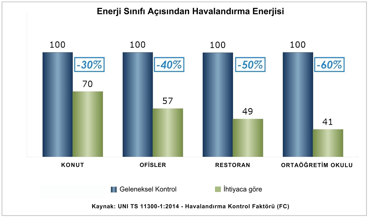 UNI TS 11300-1:2014, talep odaklı havalandırma kontrolüyle sağlanan enerji tasarrufunu nicel olarak belirlemekte ve binanın enerji sınıflandırmasında daha iyi bir derecelendirme sağlamaktadır.